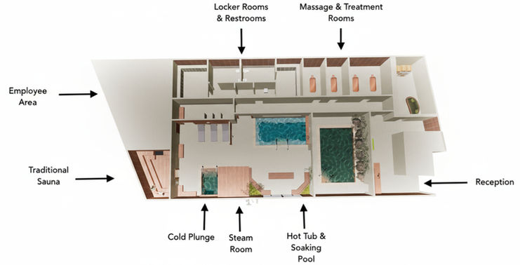 Beyond the baths, Grotto features massage and spa treatment rooms for deeper renewal, as well as lounges and gathering areas where guests can unwind, connect, and spend time together. The communal bathhouse is designed to balance restoration and social connection — a place to soak, sweat, and belong.